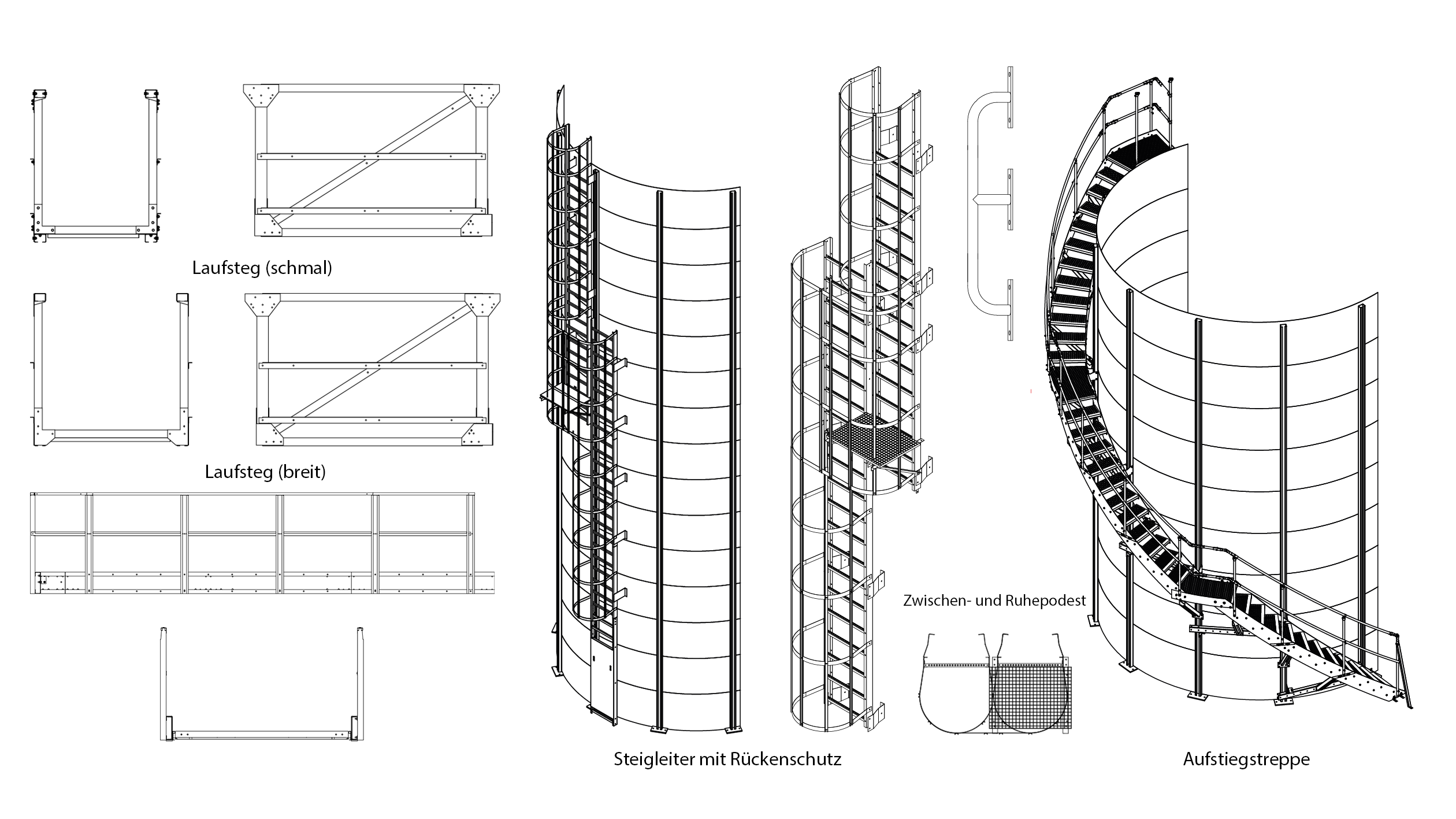 Für die sichere Begehung der Silos stehen Silolaufstege in schmaler und breiter Ausführung zur Verfügung, beide mit Geländer und rutschfester Lauffläche aus Gitterrosten.